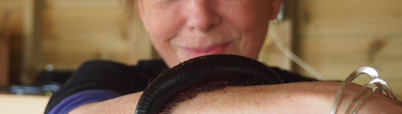 ‘Burt The millipede’ may look a bit ‘creepy’ to some of you. But he actually feels like solid, shiny plastic to touch. Not greasy or slithery like you may imagine? His millions of feet …. are like velcro  (or a clothes brush …) very sturdy. When you put one on your arm they stick just like velcro would too (it doesn’t hurt and actually feels quite therapeutic.)  They don’t smell horrid either. Remember, even if you think ‘nature’ is ugly, everything, yes … everything has feelings. All animals feel pain and have emotions.