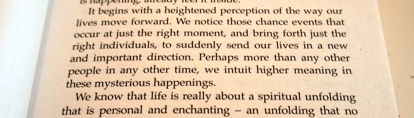 This is a page I just opened from the Celestine Prophecy. It is not a bible or book of instruction. It is a book about nature and freedom. A story book. They say the book ‘finds you.’ It found its way to me many years ago. I gave it to my youngest son on his 18th Birthday.