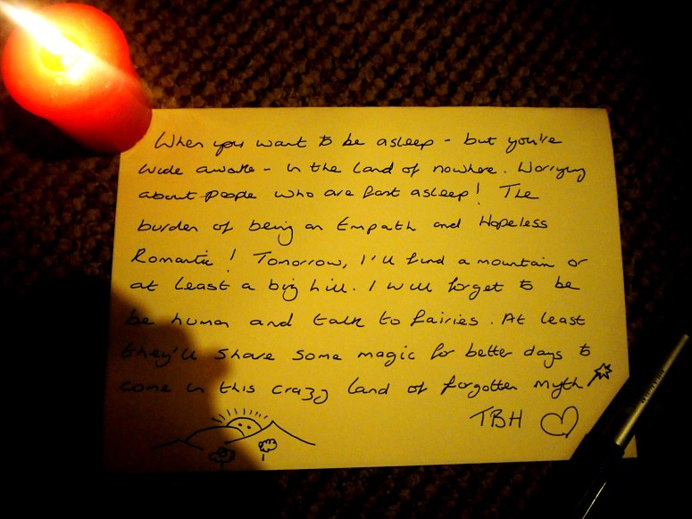 Isn’t handwriting fascinating … I don’t know what’s more captivating. Words or the way they’re written? I’m a left paw and I never write the same way. I can write with my eyes shut too. (I’m a left-handed dyslexic with a very big imagination.) Right now … I’ve got dreadful insomnia. Cannot stop worrying. Then when I am tired and able to sleep it will inevitably be time to get up! The joy of trying to write a book in isolation. It’s getting to me … And now I will meditate to see if anyone else is conscious. Or maybe I will craft some geometrical piece of art. Either way, I am in the wide awake club … Oh Fuck! TBHΒ©
