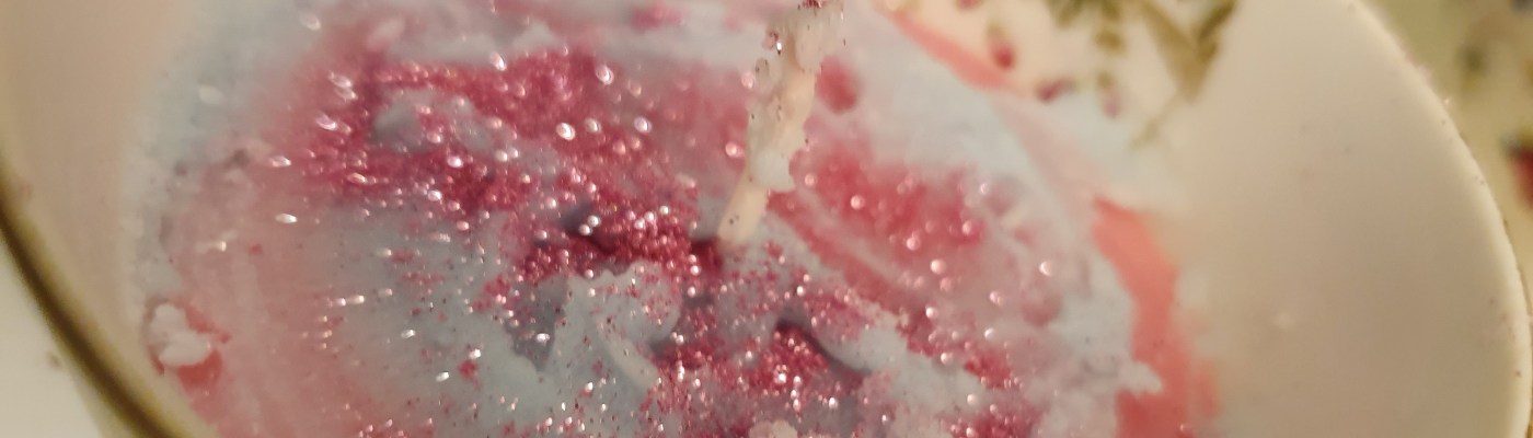 The wax had to be melted to around 90 degrees and then left to cool to around 55 degrees. It is suggested you add 10% oil (scent) to the weight of wax used. I added a tiny drop of colour to create pink or blue candles. I used glasses and cups I had available, following all guidelines. I prepared each vessel with a wick that sticks to the base of the candle holder.