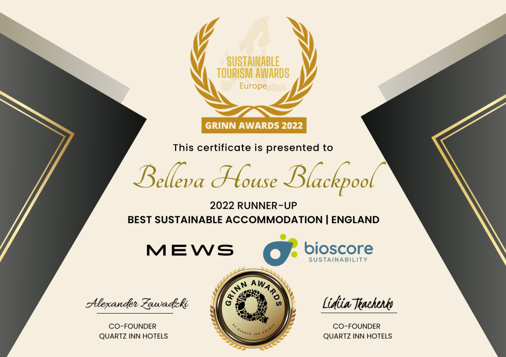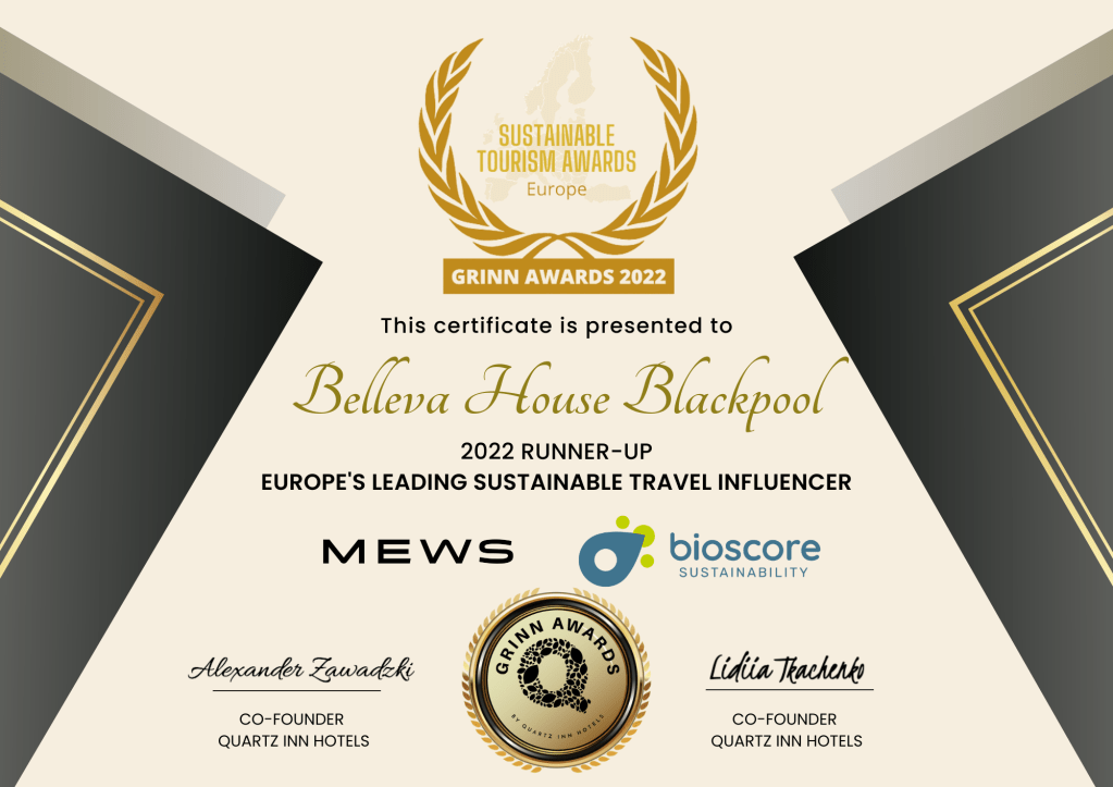 I want to say to Quartz Inn Hotels I love what you are doing. Never give up. You are a breath of real air. And to any person or collective, facing a challenge. Focus on the positive and remember, condemnation of innocence and aptitude means you are doing something right. Let them talk. Be great and keep going. You are planting lots of trees in exchange for sponsorships. A gap in the market, where small independent businesses with a difference can swim stronger amongst sharks. I want to thank my loyal helper Danielle Robinson, my son James, Stay Blackpool and everyone who worked on the project and did not let me down. Belleva is also proud to be runner up in three further categories.